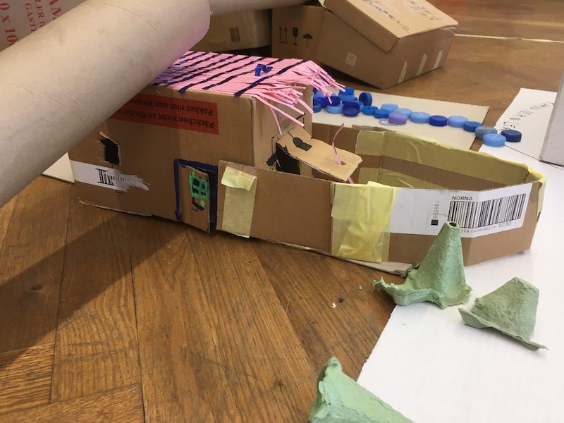Wir betrachten Materialien, die augenscheinlich Müll sind. Leere Joghurtbecher, Tetrapacks, Bananenkisten, ausgelesene Zeitungen, und Schuhkartons ohne Schuhe und viele mehr.